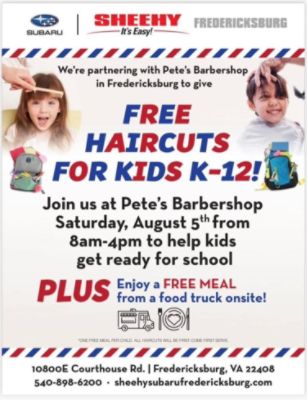On Saturday, August 5th, Sheehy Subaru of Fredericksburg set up an event to provide free haircuts to kids in grades K-12! General Manager DJ Bruce reached out to Pete, of Petes Barbershop to help put on this event, and he was immediately eager to help! Pete, along with three other barbers: Paz, Robin, and Dave all jumped right in and provided haircuts from 8am until 4pm. Many parents voiced their appreciation and gratitude for taking the time to provide this much needed service for kids, some of which had never had a professional haircut before! All the kids were excited to be able to go back to school with a fresh new style; especially those who opted for lightning bolts! All in all, 101 haircuts were done! Free breakfast and lunch were also provided to all who showed up. Chicken biscuits and hashbrowns from Chik Fila were served for breakfast. For lunch, The Dog House, We let the Dogs Out Food Truck came out and served lots of yummy hotdogs and snacks! This was the first time Sheehy Subaru of Fredericksburg provided this kind of event in the community and because of its great success, plans are already started for next year! Big shout out to The Dog House, We Let the Dogs Out food truck for coming out and serving the community delicious food while everyone waited! Huge Thank You to Petes Barbershop for opening up their facilities and providing their skills to make this event a HUGE SUCCESS!!